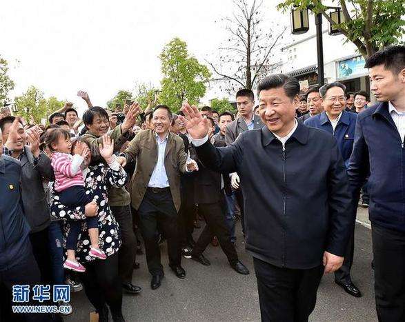 2016年4月24日至27日,中共中央總書記、國家主席、中央軍委主席習近平在安徽調(diào)研。這是4月25日下午,習近平在滁州市鳳陽縣小崗村向村民們問好。新華社記者李濤攝