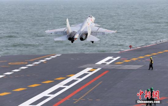 資料圖:中國海軍遼寧艦在渤海某海域進行艦機融合訓練,新一批殲-15艦載戰斗機飛行員駕機完成觸艦復飛、阻攔著艦等多個課目訓練。 中新社發 李唐 攝
