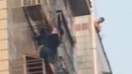 千鈞一發之際,一名30歲左右的男子沖出人群,將鞋一脫,背包一甩,沿著防護欄不到兩分鐘就徒手爬上了五樓,并迅速移動到男孩身邊。熱心男子雙腳踩著五樓的防盜網,左手拉著防盜網借力,右手不停敲擊卡著男孩的六樓防盜網,并試圖將孩子推上去。