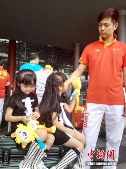 北京時間8月17日上午9時許,朱啟南隨中國射擊隊回國,他的妻子和一對雙胞胎女兒現身北京首都機場迎接他們歸來。見面后朱啟南與妻子說的第一句話就是“你辛苦了”,妻子回道“不會”。圖文 尚虹波 張珺