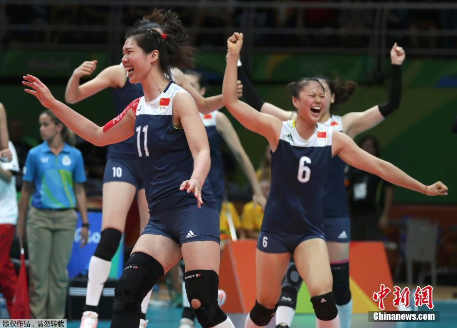當地時間8月18日,2016里約奧運會女排半決賽,中國隊3:1戰勝荷蘭隊晉級決賽。這是中國女排時隔12年再次進入奧運決賽。圖為中國姑娘慶祝勝利。