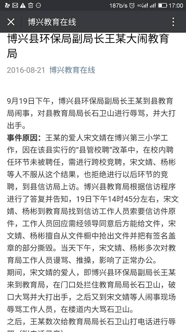 8月21日,山東省濱州市博興縣教育局在其官方微信“博興教育在線”,發布題為《博興縣環保局副局長王某大鬧教育局》的文章,稱8月19日下午,博興縣環保局副局長王某到縣教育局鬧事,對博興縣教育局局長石衛山進行辱罵,并大打出手。