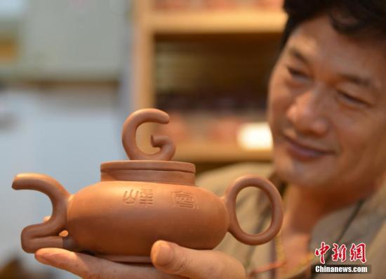 資料圖:8月3日,紫砂壺技藝傳承人展示制作完成的“G20元素”壺。時間進入8月,二十國集團(G20)杭州峰會腳步愈發臨近,附有G20元素的手工品似乎成了手工傳承人們的“必修課”,各式各樣的產品讓原本不起眼的原材料變得異常鮮活。中新社記者 張茵 攝