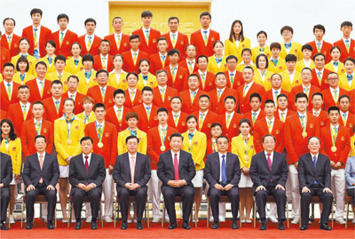 8月25日,黨和國家領導人習近平、李克強、張德江、俞正聲、劉云山、王岐山、張高麗等在北京人民大會堂會見第31屆奧林匹克運動會中國體育代表團全體成員。新華社記者蘭紅光攝