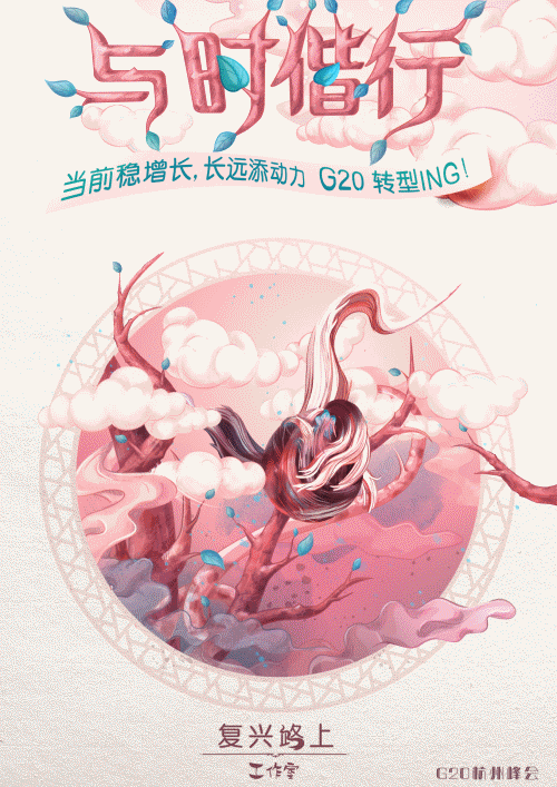 第一幅,“與時偕行”。作為2016年G20杭州峰會主席國,中國將積極推動G20“破繭新生”,從短期的危機應對平臺向長期治理平臺轉型,實現轉型和發展。