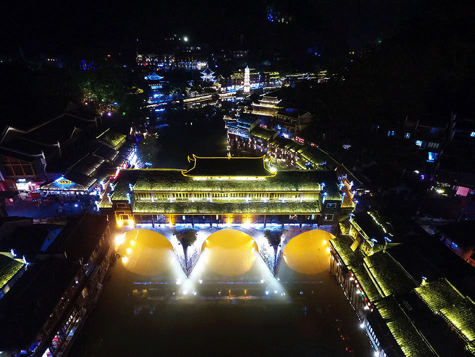 虹橋旁的吊腳樓均分上下兩層,,俱屬五柱六掛或五柱八掛的穿斗式木結構,是鳳凰古城具有濃郁苗族建筑特色的古建筑群之一。新華網 王超攝