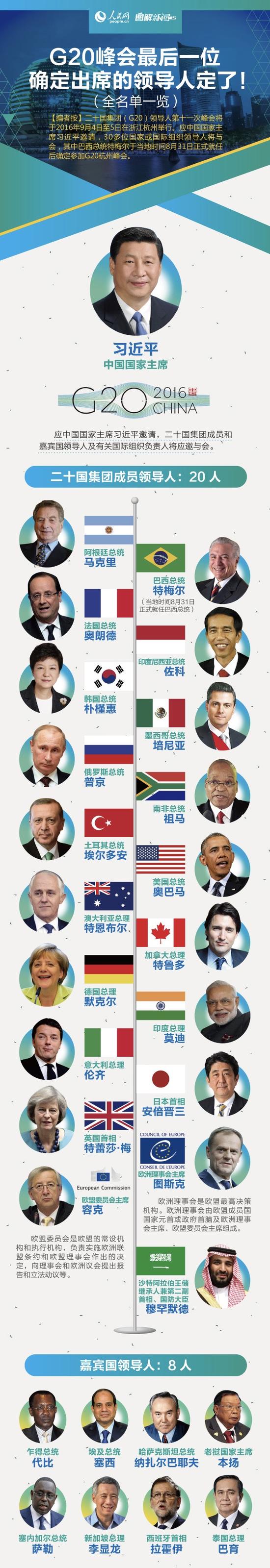 G20峰會將于9月4日至5日在浙江杭州舉行。應中國國家主席習近平邀請,30多位國家或國際組織領導人將與會,其中巴西總統特梅爾于當地時間8月31日正式就任后確定參加G20杭州峰會。都有哪些重要人物?戳名單 一起看看吧~