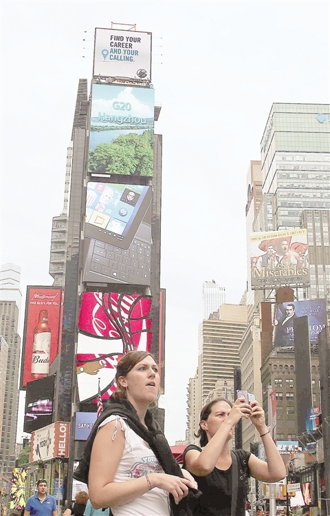 9月1日,美國紐約時報廣場“中國屏”播放G20杭州峰會宣傳片。在G20杭州峰會即將開幕之際,G20杭州峰會宣傳片9月1日登上紐約時報廣場“中國屏”,向游客展示峰會主辦地杭州的獨特魅力。 新華社記者吳蓉攝