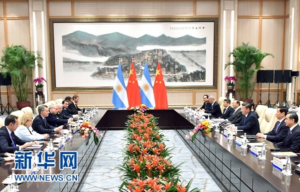 習近平強調(diào),下階段,兩國要保持高層密切聯(lián)系,把握好雙邊關(guān)系發(fā)展大方向,加強政策溝通和發(fā)展戰(zhàn)略對接,把各自優(yōu)勢和需求更好結(jié)合起來,推動貿(mào)易、投資、金融“三駕馬車”齊頭并進。促進貿(mào)易便利化,優(yōu)化貿(mào)易結(jié)構(gòu),推動雙邊貿(mào)易穩(wěn)定均衡增長。落實好鐵路、水電、核電等現(xiàn)有重大合作項目,探討深化金融合作。加強文化、科技、旅游、足球、地方等領(lǐng)域交流合作,辦好明年中阿建交45周年慶祝活動。中方愿同阿方就氣候變化、全球經(jīng)濟治理等重大議題保持密切溝通。中方祝賀阿根廷擔任2018年二十國集團主席國。希望阿方繼續(xù)大力支持中拉關(guān)系發(fā)展和中拉整體合作。