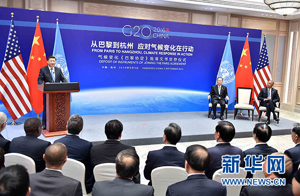 9月3日下午,中國國家主席習近平和美國總統奧巴馬先后向聯合國秘書長潘基文交存氣候變化《巴黎協定》批準文書。
