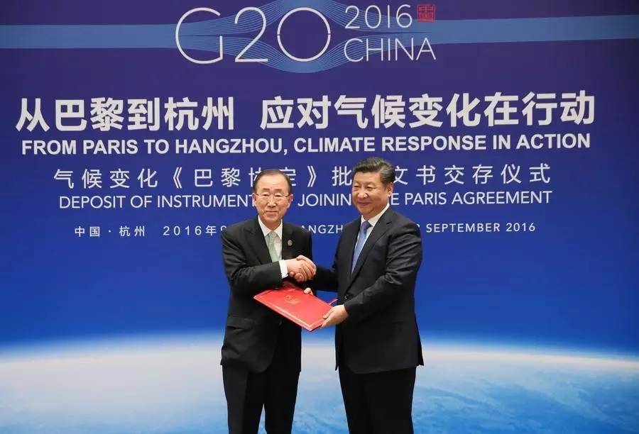 9月3日下午,國家主席習近平同美國總統奧巴馬、聯合國秘書長潘基文在杭州共同出席氣候變化《巴黎協定》批準文書交存儀式。習近平向潘基文交存中國氣候變化《巴黎協定》批準文書。