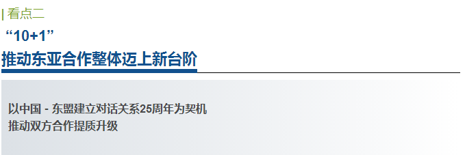 東盟是東亞合作的中心和中國周邊外交的優(yōu)先方向。中國-東盟建立對話關(guān)系25年來,雙方政治互信不斷加深,務(wù)實(shí)合作成果豐碩。李克強(qiáng)總理將在10+1領(lǐng)導(dǎo)人會議暨中國-東盟建立對話關(guān)系25周年紀(jì)念峰會上全面回顧雙方關(guān)系發(fā)展成就,總結(jié)有益經(jīng)驗(yàn),繼續(xù)推動落實(shí)“2+7合作框架”,倡議在鞏固和深化政治安全和經(jīng)貿(mào)合作同時(shí),以教育和旅游為優(yōu)先方向,將人文交流打造為雙方關(guān)系新支柱,為雙方合作注入新動力。中方將重申對東盟睦鄰友好合作政策,強(qiáng)調(diào)中方將一如既往地支持東盟共同體建設(shè),支持東盟在區(qū)域合作中的中心地位,支持東盟在國際地區(qū)事務(wù)中發(fā)揮更大作用。