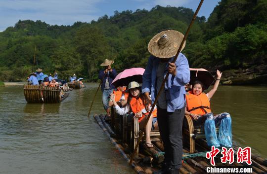 圖為港澳大學生乘竹排游覽九曲溪!蚊鳌z