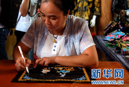 “繡娘”丁明煥接受采訪(fǎng)時(shí)正在做刺繡,她說(shuō)完成這件刺繡大概需要一個(gè)星期,能賣(mài)到600元。新華網(wǎng)陳俊松 攝