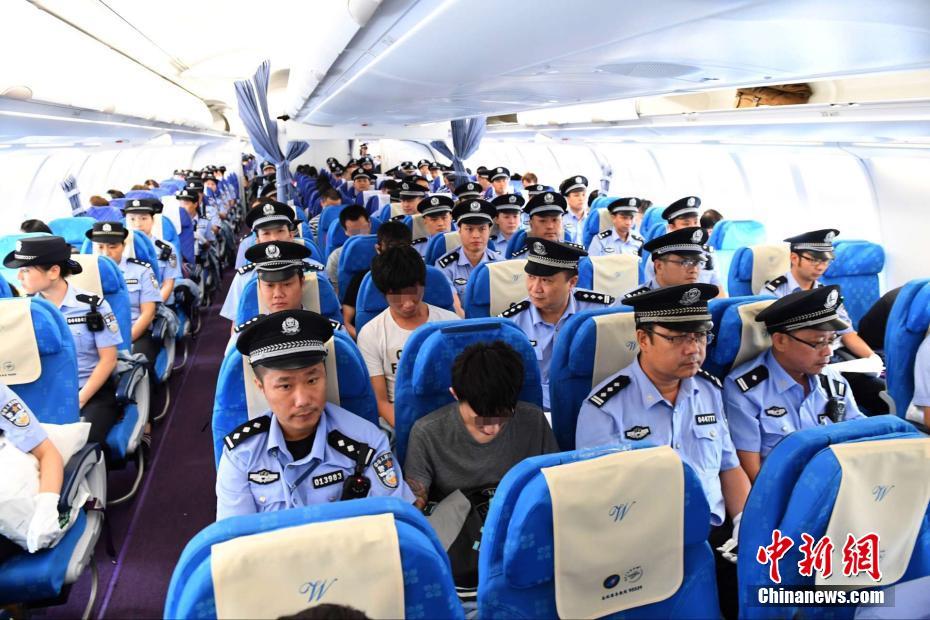 廣東省公安廳9月8日通報,9月2日,在中國公安部指揮協調下,該廳組織廣州警方出動300名警力,乘坐兩架南方航空公司的民航包機將129名電信詐騙嫌疑人(其中大陸籍51名、臺灣籍78名)從亞美尼亞帶回廣州,涉及中國10多個省區市的“颶風20”號跨境電信網絡詐騙案成功告破,本案也是中國大陸從國外帶回臺灣籍電信網絡詐騙犯罪嫌疑人數最多的案件。中新社記者 景國民 攝