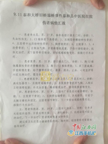 已獲救人員名單:橋北邊:1。吳其華,男,29歲,上饒人,胸部挫傷,肋骨骨折。2。黃 勇,男,30歲,泰和人,重癥監護室搶救。
