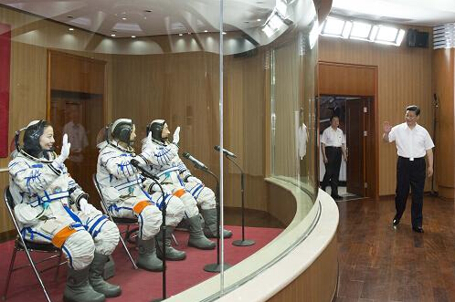 2013年6月11日,習近平總書記來到酒泉衛星發射中心航天員公寓問天閣,為即將出征的航天員壯行。新華社記者 李學仁 攝
