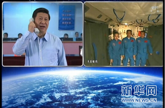 13天后,習近平總書記在北京航天飛行測控中心,與正在天宮一號執行任務的三位航天員進行天地通話。習近平表示,飛天夢是強國夢的重要組成部分,隨著中國航天事業的快速發展,中國人探索太空的腳步會邁得更大、更遠。