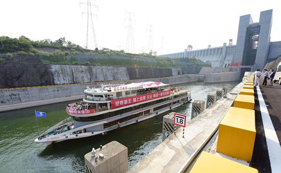 9月18日,“長江三峽9號”游輪駛離升船機進入下游引航道。新華社記者 程敏 攝