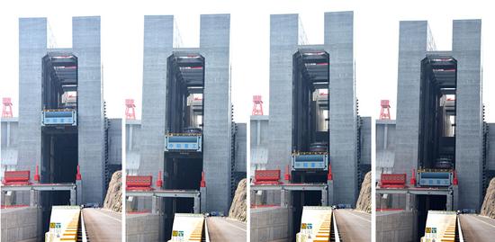 從左至右為升船機的承船廂從上降下(拼版照片)。新華社記者 程敏 攝