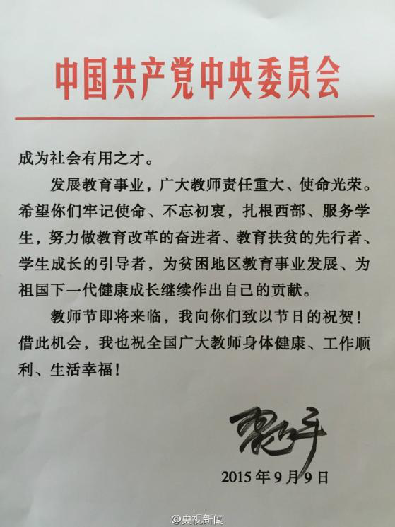 習(xí)近平給“國(guó)培計(jì)劃(2014)”北京師范大學(xué)貴州研修班全體參訓(xùn)教師回信