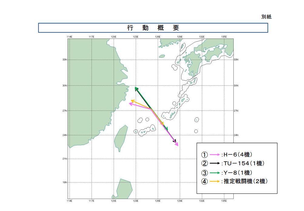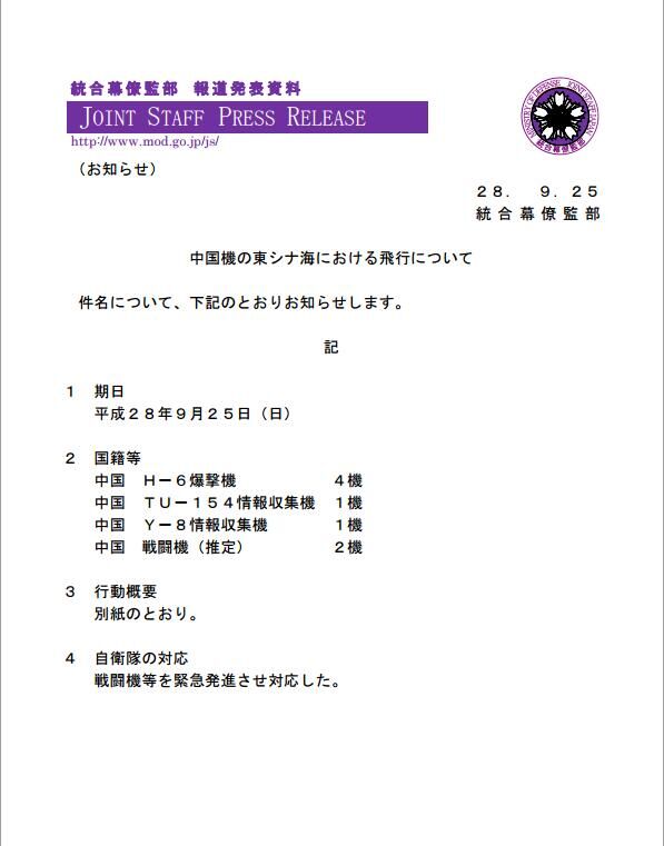 根據日本防衛省統合幕僚監部9月25日當天發布的公告顯示,25日當天共有8架中國軍機出現在東?沼颉8架軍機分別為4架H-6戰略轟炸機、1架TU-154電子偵察機、1架Y-8偵察機。另外2架軍機據推斷可能是中國空軍戰機。