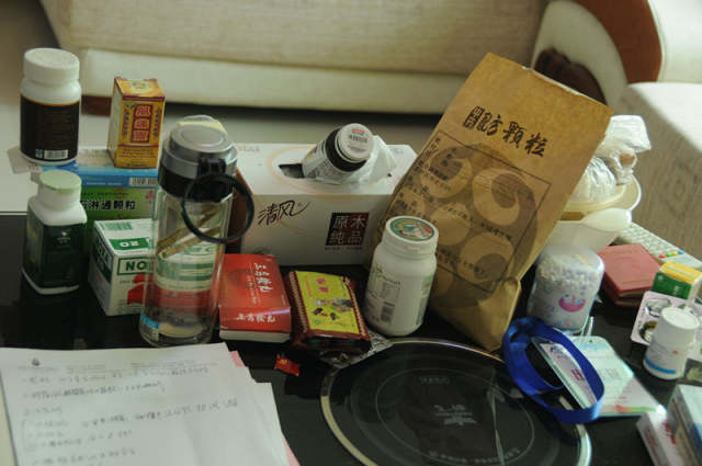 在姜仕坤宿舍里的桌上,除了書、筆記本外,就是各類藥品(7月24日攝) 。新華社記者 李春惠 攝
