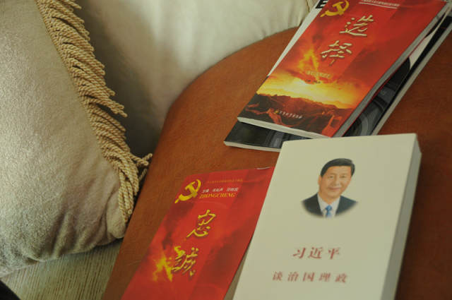 在姜仕坤宿舍,沙發扶手上放著《習近平談治國理政》、《選擇》、《忠誠》幾本書(7月24日攝)。新華社記者 李春惠 攝