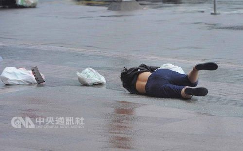 臺風(fēng)“鲇魚”侵襲臺灣,9月27日上午臺北市已出現(xiàn)間歇的風(fēng)雨,路上民眾被強(qiáng)風(fēng)吹倒在地。臺灣“中央社”記者王飛華攝