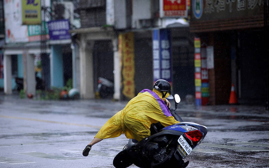 9月27日,花蓮,今年第17號(hào)臺(tái)風(fēng)“鲇魚(yú)”正逼近臺(tái)灣,根據(jù)臺(tái)氣象部門(mén)預(yù)測(cè),“鲇魚(yú)”暴風(fēng)圈27日清晨碰觸臺(tái)灣東部陸地,27日午后臺(tái)風(fēng)中心于花蓮、臺(tái)東交界處登陸,臺(tái)氣象部門(mén)今天下午上修15縣市風(fēng)力,雙北、中彰及云嘉南12級(jí),宜蘭14級(jí)、花蓮16級(jí)。圖為花蓮,一個(gè)騎摩托車(chē)的人被吹倒。