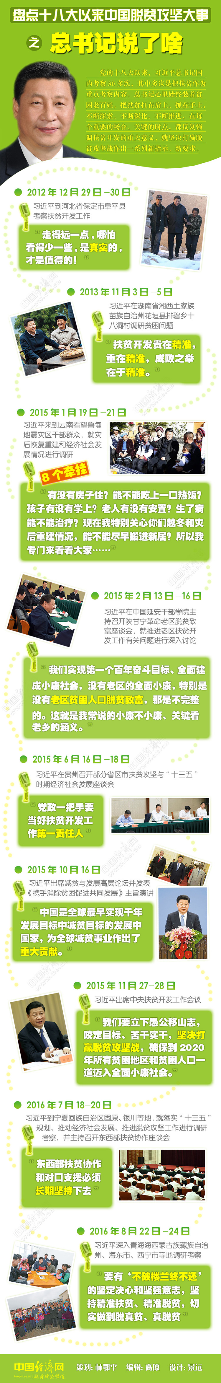 今起,中國經濟網策劃制作系列圖解“盤點十八大以來中國脫貧攻堅大事”。“大事”分三部分:第一部分“總書記說了啥”;第二部分“標桿活動回眸”;第三部分為“重大政策回顧”。今日首推《盤點十八大以來中國脫貧攻堅大事之總書記說了啥》。