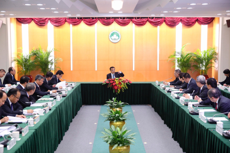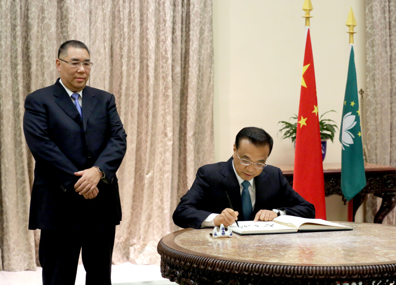 【李克強視察澳門特區(qū)政府總部并聽取匯報】李克強總理10日下午視察澳門特區(qū)政府總部,與特區(qū)政府主要官員合影,并在嘉賓簽名冊上簽名。在聽取崔世安行政長官及特區(qū)政府5位司長的工作匯報后,李克強作了重要講話。他說,中央政府最近根據(jù)新形勢下澳門發(fā)展的新需求,提出了多項惠澳政策。