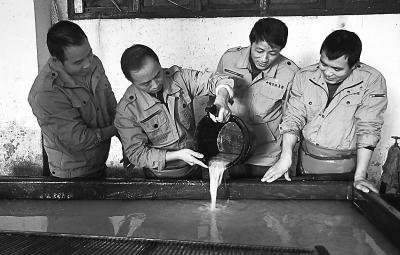 “一開始當撈紙工,我前兩個月沒完成任務。只掙到十幾塊錢,基本等于白干。宣紙廠采取計件工作制,每天工作定額是800張合格紙,只有下限,不設上限。因為我技術動作不熟練,廢品率就高。要么是從水槽撈出的紙張厚薄不均(導致分量不夠標準),要么是紙上有水皺(皺褶)、水泡(鼓泡)或水洞(窟窿)。出師不利,我才知道,跟以前自己下地種田插秧不同,撈紙可不是那么容易的事。這里面還真有些高深的門道呢。”