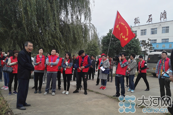 中共葉縣縣委黨史研究室工作人員王貴云為采訪團講解紅九軍的成立經(jīng)過。