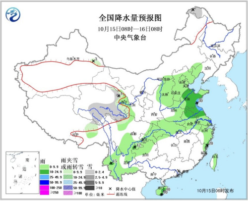 15日08時至16日08時,華北、黃淮、江淮、江漢、江南東北部、西南地區東部和南部、海南島、臺灣大部等地有小到中雨,其中,海南島東部、山東南部、江蘇北部等地的局部地區有大雨;青海中東部、甘肅西南部、西藏中部、川西高原北部等地有小到中雪(雨)或雨夾雪。新疆東部、甘肅中西部、內蒙古中西部等地有4~6級風。南疆盆地南部有揚沙或浮塵。