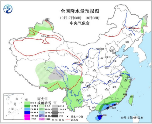 17日08時至18日08時,江南東部、華南、西南地區東部和南部、臺灣等地有小到中雨,其中,廣東東部沿海、海南島等地的部分地區有大雨或暴雨,海南島東北部局地有大暴雨(100~110毫米)。新疆北部、黑龍江東北部、青海南部、西藏中部等地有小雪或雨夾雪。南海北部和中部海域、北部灣將有7~9級大風,其中南海中部部分海域的風力可達10~13級,臺風中心經過附近海域將有14~15級大風、陣風16~17級。