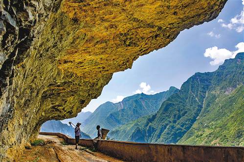 這條路,如一條腰帶,鑲嵌在老虎嘴崖壁上,不僅險象環生,時常有石塊砸落,在雨天時更是泥濘難行,當地人稱之為“天路”。