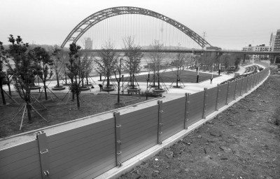 這種由武漢市城市防洪勘測設計院牽頭自主研發的拼裝式防洪墻,立柱為不銹鋼材質,擋板為特殊材質的鋁合金,強度較大,能夠頂住洪水長時間浸泡和高強度加壓。在水位較低時,可拆除拼裝式防洪墻。汛期如果需要使用該防洪設施,可以迅速拼裝完畢。圖為位于漢口江灘流通巷段已經投入使用的拼裝式防洪墻(10月19日攝)。新華社發