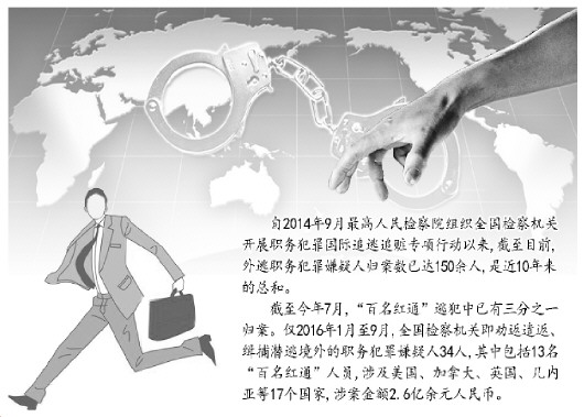 “百名紅通”2號逃犯、江西省鄱陽縣財政局經濟建設股原股長李華波、“百名紅通”4號逃犯黃玉榮、遼寧省鳳城市委原書記王國強……自2014年9月最高人民檢察院組織全國檢察機關開展職務犯罪國際追逃追贓專項行動以來,截至目前,外逃職務犯罪嫌疑人歸案數已達150余人。