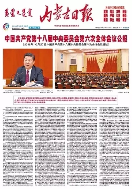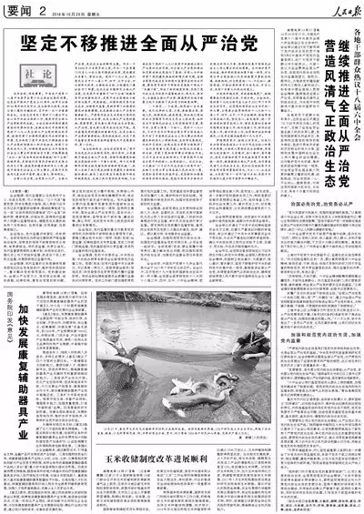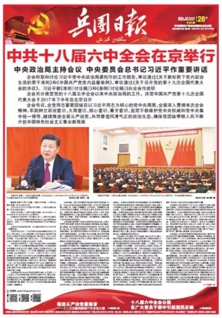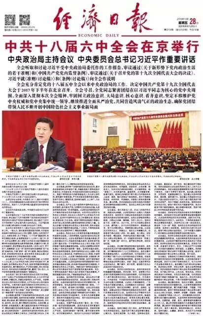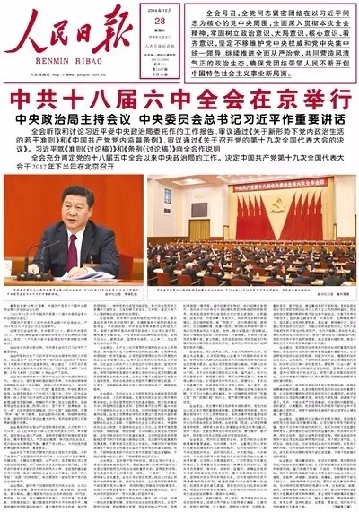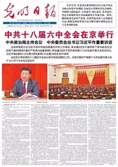 全國各大報紙頭版均聚焦十八屆六中全會,十八屆六中全會公報被放在了報紙版面的最醒目位置,配以通欄標題和莊嚴的會場照片。人民日報刊發社論《堅定不移推進全面從嚴治黨》、新華社刊發社評《在黨中央堅強領導下推進全面從嚴治黨》,高屋建瓴,闡釋全會的重要意義,發出堅定不移推進全面從嚴治黨的最強音。