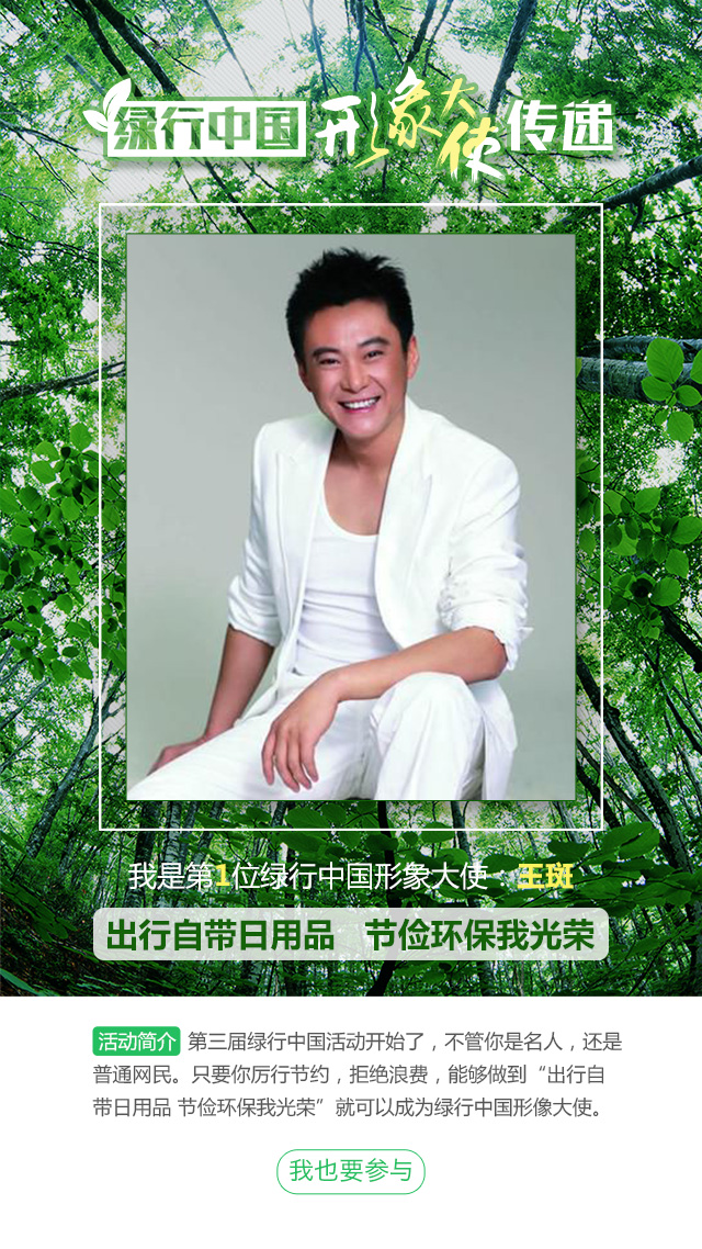 而作為本屆活動(dòng)的最大亮點(diǎn),綠行中國(guó)首次聘請(qǐng)國(guó)家一級(jí)演員王斑擔(dān)任形象大使,發(fā)揮了名人效應(yīng),讓綠色環(huán)保家喻戶曉。王斑與妻子曹穎都通過微博轉(zhuǎn)發(fā)了綠行中國(guó)的活動(dòng)報(bào)道,并呼吁:讓我們從小事做起,從自我做起,“綠行中國(guó)”功在當(dāng)下,利在千秋,出行自帶日用品,節(jié)儉環(huán)保我光榮。煙臺(tái)最美女孩刁娜也參與其中,在微信中呼吁踐行綠色環(huán)保。在他們的號(hào)召和帶動(dòng)下,近200名網(wǎng)友紛紛參與,爭(zhēng)當(dāng)形象大使,厲行節(jié)約,拒絕浪費(fèi)。