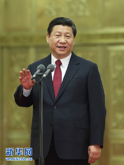 2014年1月6日,黨和國家領(lǐng)導(dǎo)人習(xí)近平、李克強、張德江、俞正聲、劉云山、王岐山、張高麗等在北京人民大會堂會見探月工程嫦娥三號任務(wù)參研參試人員代表。這是習(xí)近平發(fā)表重要講話。新華社記者 蘭紅光 攝