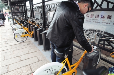 2015年12月8日,浙江烏鎮(zhèn),一位游客正在通過(guò)掃描二維碼,租賃自行車(chē)。新京報(bào)記者 李冬 攝