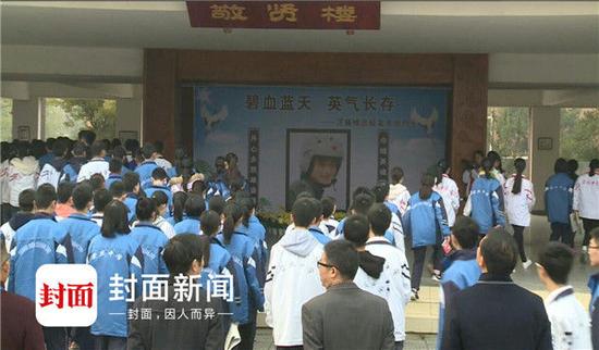 師生們默哀三分鐘,最后,同學們來到了敬賢樓,向余旭的遺像獻花。敬賢樓底樓,余旭的照片被放大到一米多高。照片中,她一身戎裝,淺笑盈盈地望著大家,仿佛起飛前與大家作別。