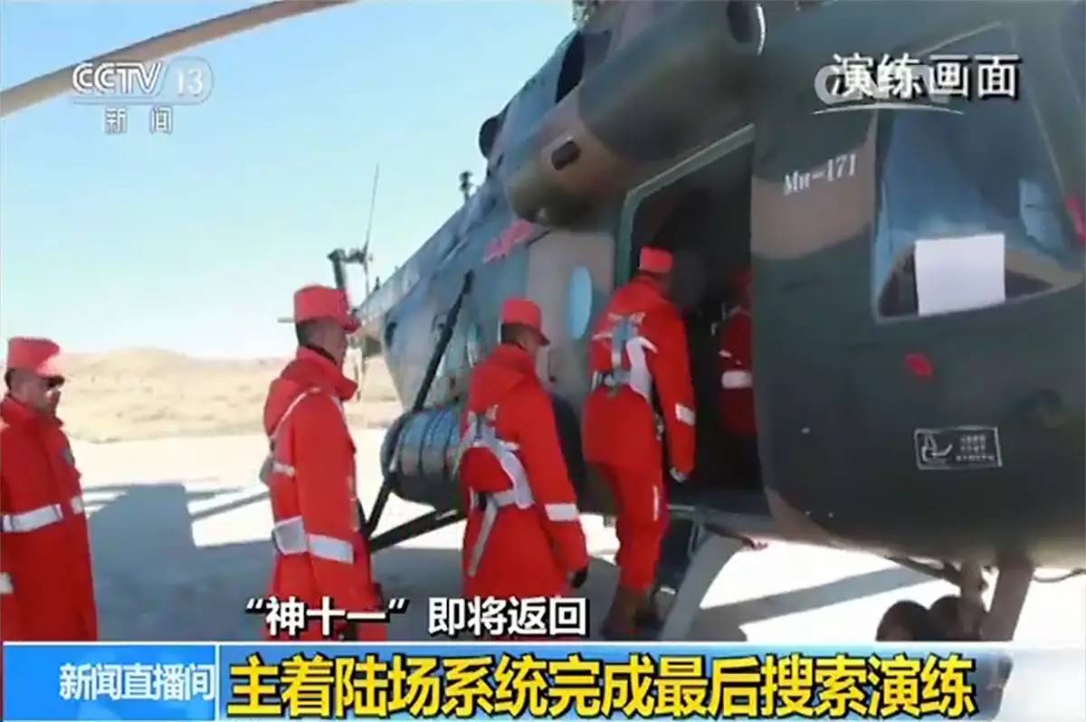 這是神舟十一號返回前,主著陸場進行的最后一次系統綜合演練,空中和地面分隊完全按照1:1的全任務狀態和流程進行。演練模擬飛船搭載2名男航天員正常返回主著陸場區,航天員健康狀況良好,返回艙呈傾倒姿態。