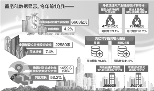 全球貿(mào)易增速放緩,中國引資“答卷”亮點(diǎn)依舊。11月17日,商務(wù)部發(fā)布最新數(shù)據(jù)顯示,今年前10月,不含銀行、證券、保險(xiǎn)領(lǐng)域數(shù)據(jù),我國實(shí)際使用外資金額6663億元,同比增長4.2%;全國新設(shè)立外商投資企業(yè)22580家,同比增長7.4%;我國對(duì)外非金融類直接投資累計(jì)投資額1459.6億美元,同比增長53.3%。
