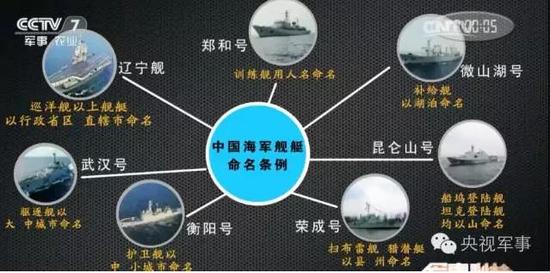 按照中國《海軍艦艇命名條例》,巡洋艦以上艦艇以行政區直轄市命名,驅逐艦以大中城市命名,護衛艦以中小城市命名,掃布雷艦和獵潛艇以縣州命名,船塢登陸艦、坦克登錄艦以山命名,補給艦以湖泊命名,訓練艦以人名命名。