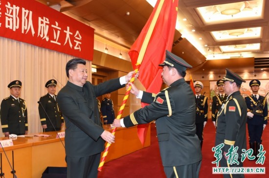 2015年12月31日,中國人民解放軍陸軍領(lǐng)導(dǎo)機構(gòu)、中國人民解放軍火箭軍、中國人民解放軍戰(zhàn)略支援部隊成立大會在八一大樓隆重舉行。中共中央總書記、國家主席、中央軍委主席習(xí)近平向陸軍、火箭軍、戰(zhàn)略支援部隊授予軍旗并致訓(xùn)詞,代表黨中央和中央軍委向同志們、向全軍部隊致以熱烈祝賀,強調(diào)要堅持以黨在新形勢下的強軍目標(biāo)為引領(lǐng),深入貫徹新形勢下軍事戰(zhàn)略方針,全面實施改革強軍戰(zhàn)略,堅定不移走中國特色強軍之路,時刻聽從黨和人民召喚,忠實履行黨和人民賦予的神圣使命,為實現(xiàn)中國夢強軍夢作出新的更大的貢獻(xiàn)。
