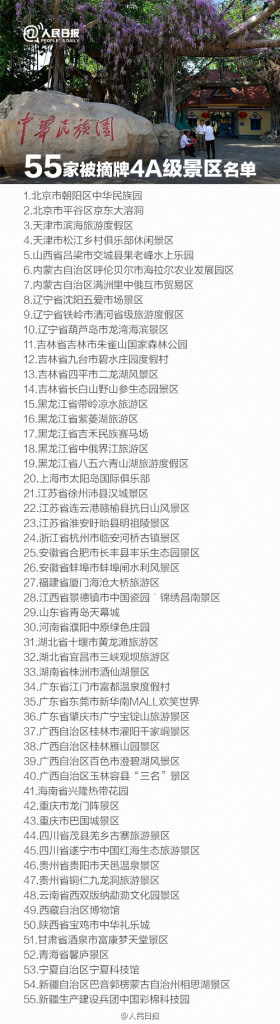 人民日報記者王珂消息,國家旅游局今日通報,截至目前,全國31個省區(qū)市均已完成對本地4A級及以下景區(qū)檢查,共有367家4A級及以下景區(qū)受到不同程度處理。其中,107家A級景區(qū)被摘牌,包括55家4A級景區(qū),黑龍江5家、吉林、廣西各4家、遼寧、江蘇、廣東各3家。