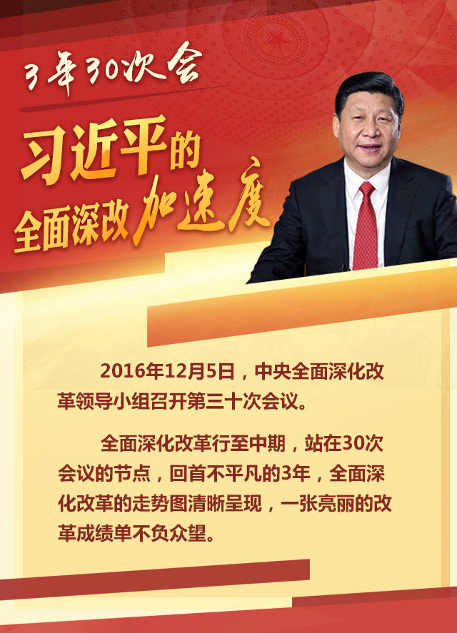 2016年12月5日,中央全面深化改革領導小組召開第三十次會議。全面深化改革啟動3年來,在習近平總書記直接領導下,中央深改組的30次會議,牢牢把握改革正確方向,及時提出階段性任務目標,著眼全局性重大問題進行頂層設計,審議通過198份改革文件,狠抓改革舉措落地,直面問題點穴開方……